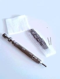 当院では、美容鍼の際に写真のような特殊器具と鍼を使用しております。多くの治療院で行われている美容鍼は筒に入れた鍼を「トントン」と叩いて鍼をするのですが、どんなに細い鍼でもやはり「チクッ感」はあります。