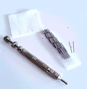 A.当院では写真のような特殊な器具と短い針を使用しています(美容鍼コース)。この特殊な器具の中に針を1本ずつ入れて、器具の頭を叩くことで針を刺すことが可能となっており、しっかりと器具を押し付けることで針の「チクッ感」を減らし極力痛み・不快感が出ないようにしております。また短い針(長さ8㎜)を用いている理由として、お顔への施術では真皮層へアプローチしたいわけですから表面から4㎜くらいの長さがあれば十分ですし、長い針を浅く刺して抜け落ちてしまうのを防ぐためにも短い針で行っております。